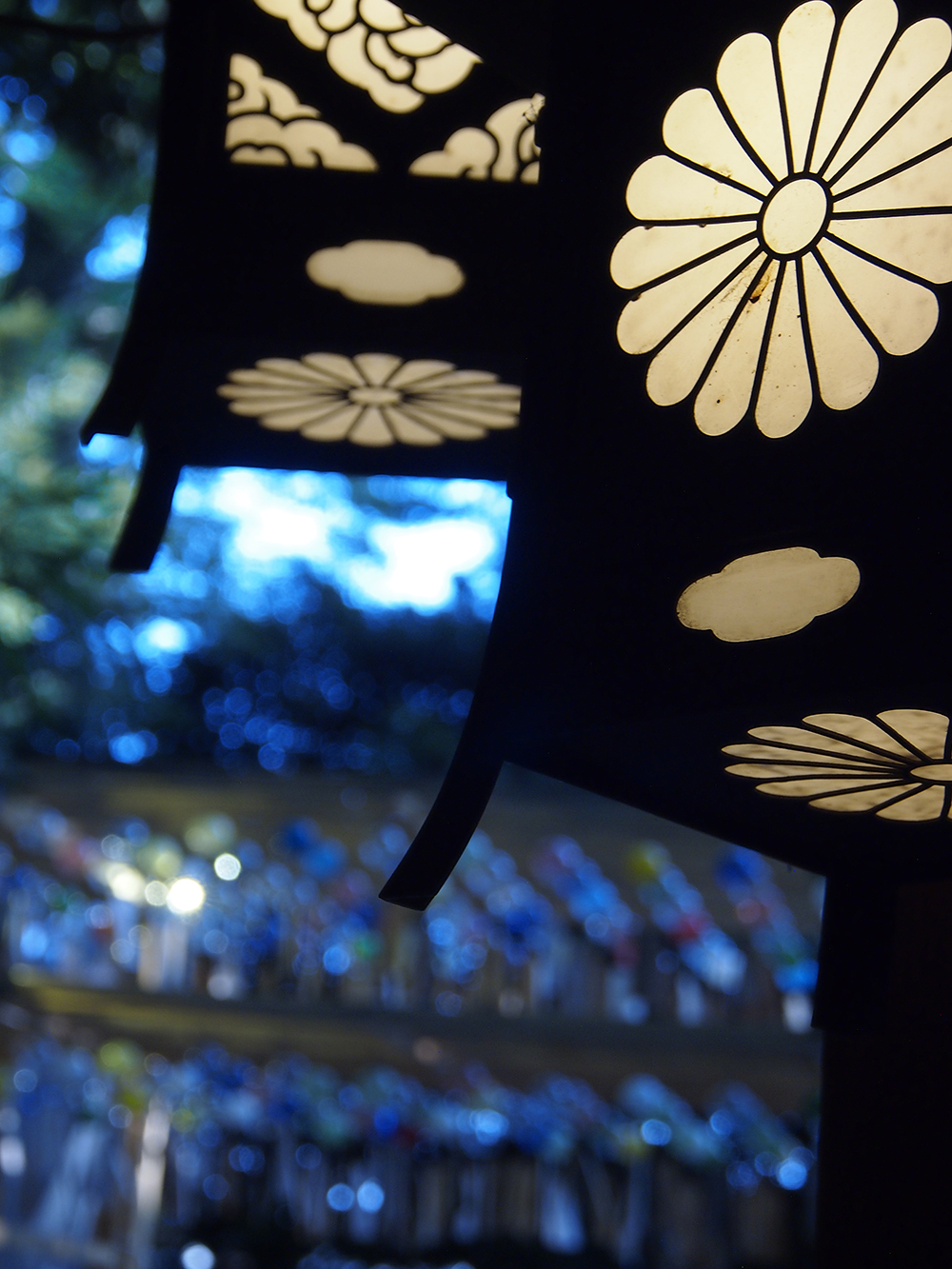 夜幕降臨後,風鈴祭則展現出另一種截然不同的魅力。當迴廊內的燈光亮起,光線從內部照亮每一個玻璃風鈴,使其化為一顆顆懸浮在夜色中的彩色寶石。神社旁的小溪會被佈置成「光之川」,點點燈光在水面上搖曳,營造出一個如夢似幻的結界。這份夜間限定的浪漫,是專屬於夏夜的溫柔。